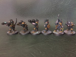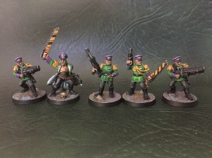 Next up we have some guards for House Malocchio – the ruling house of Hive Sevelli, and governing family for the whole planet. I have already painted members of Hose Malocchio, and so the heraldic colours were already established – this made the design for the guard uniform pretty straight forward. I used GW Mordians for some proper officious pomposity: