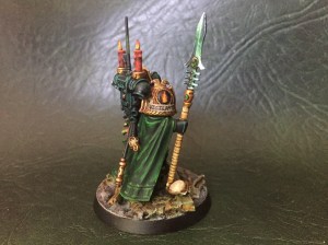 Paint-wise, I used gold a lot on this guy – it seemed appropriate for someone of his rank and grandiosity. Most of the gold on the armour got a cool purple wash, but the odd detail & the eldar bits had a slightly warmer sepia wash to make them stand out a bit. The rest of the armour is a very deep green, (a pot of Black Templar contrast paint with a good splodge of Winsor & Newton green ink) – it looks almost black, but the edge highlights bring out the green again I think. The odd recessed area of the armour has been carefully picked out in pure black Indian ink from Winsor & Newton – this has a slight reflective quality which gives a lacquered effect that I really like (it isn’t robust enough for a raised area, but can survive in a recess).