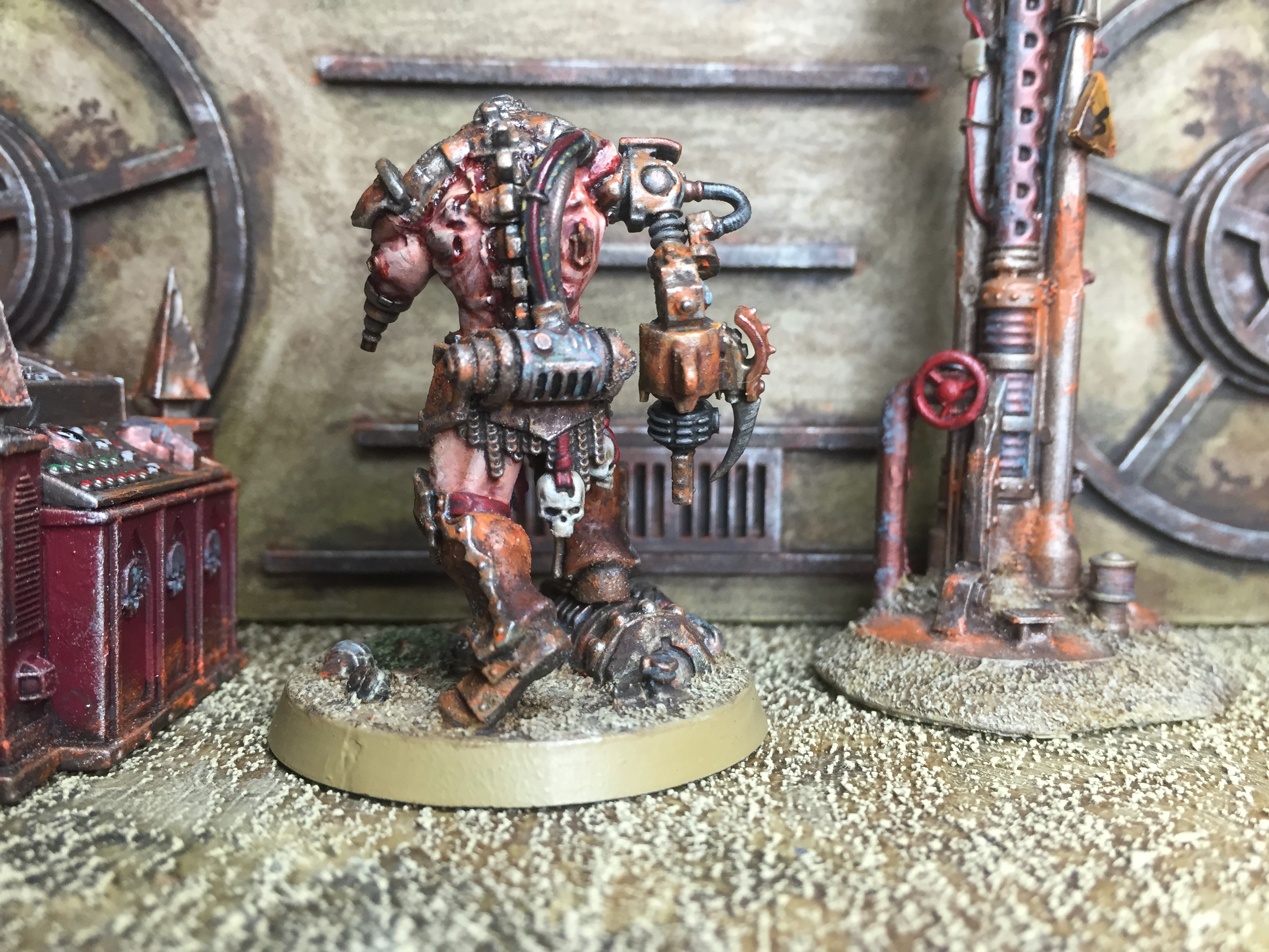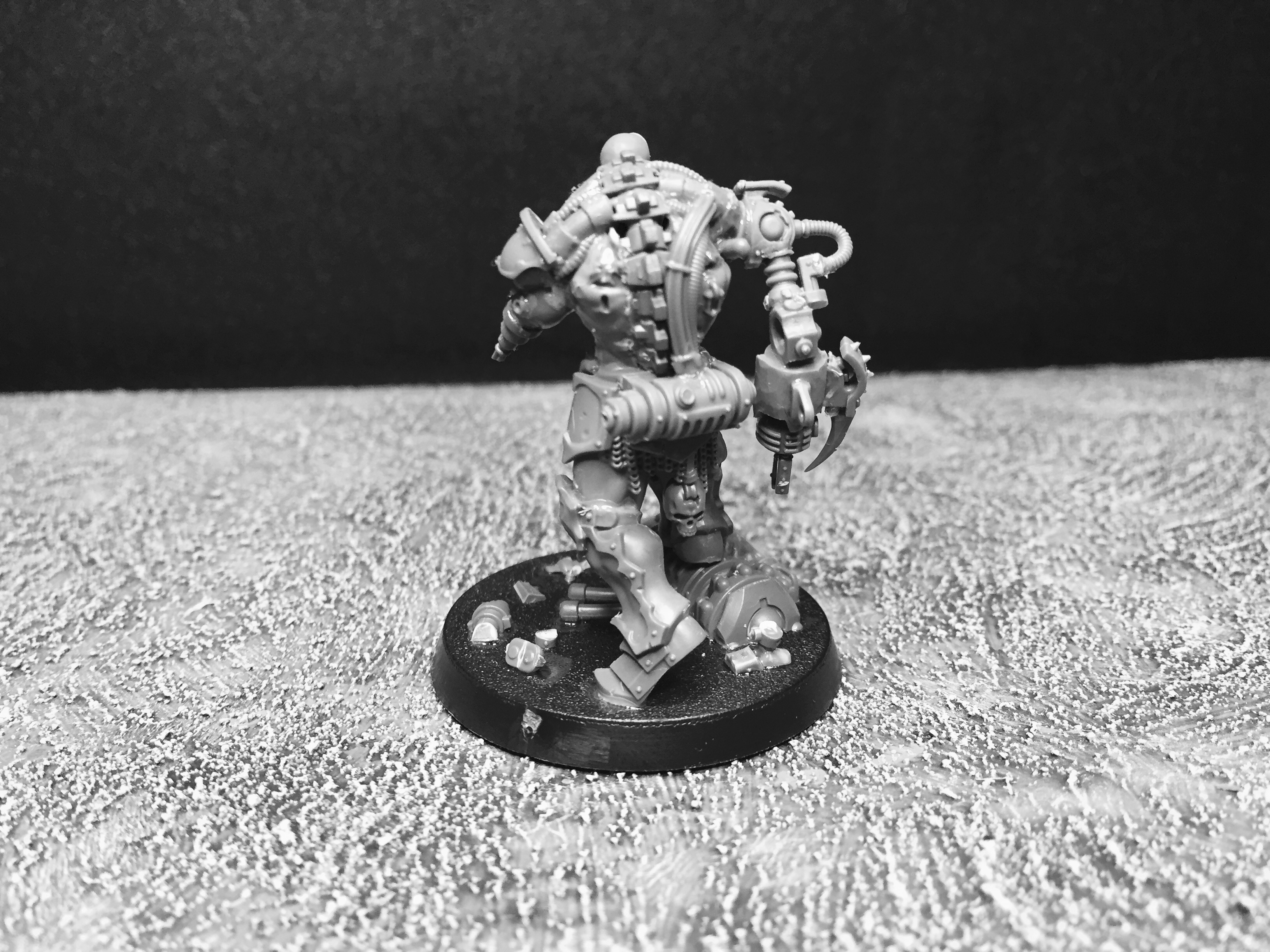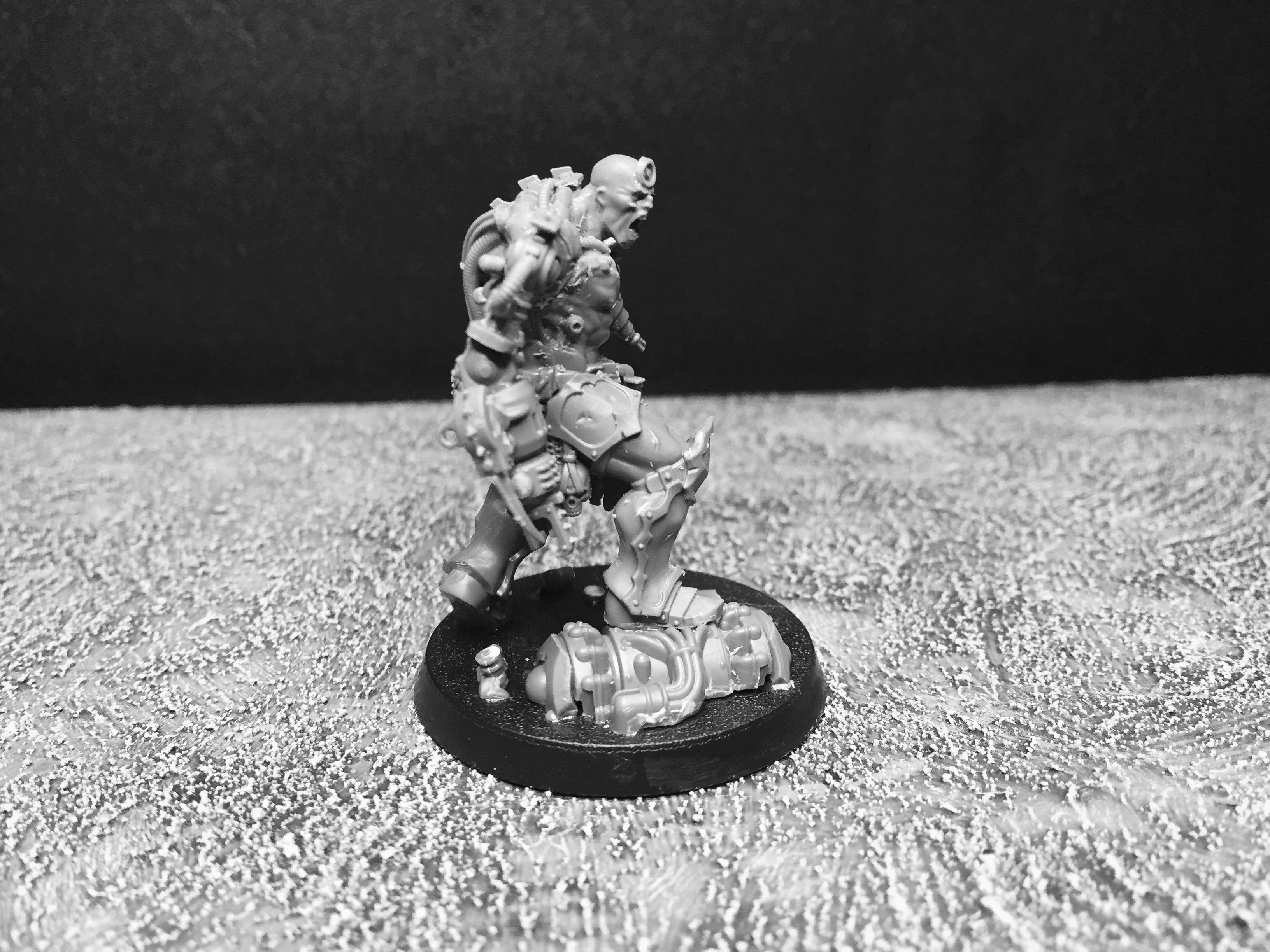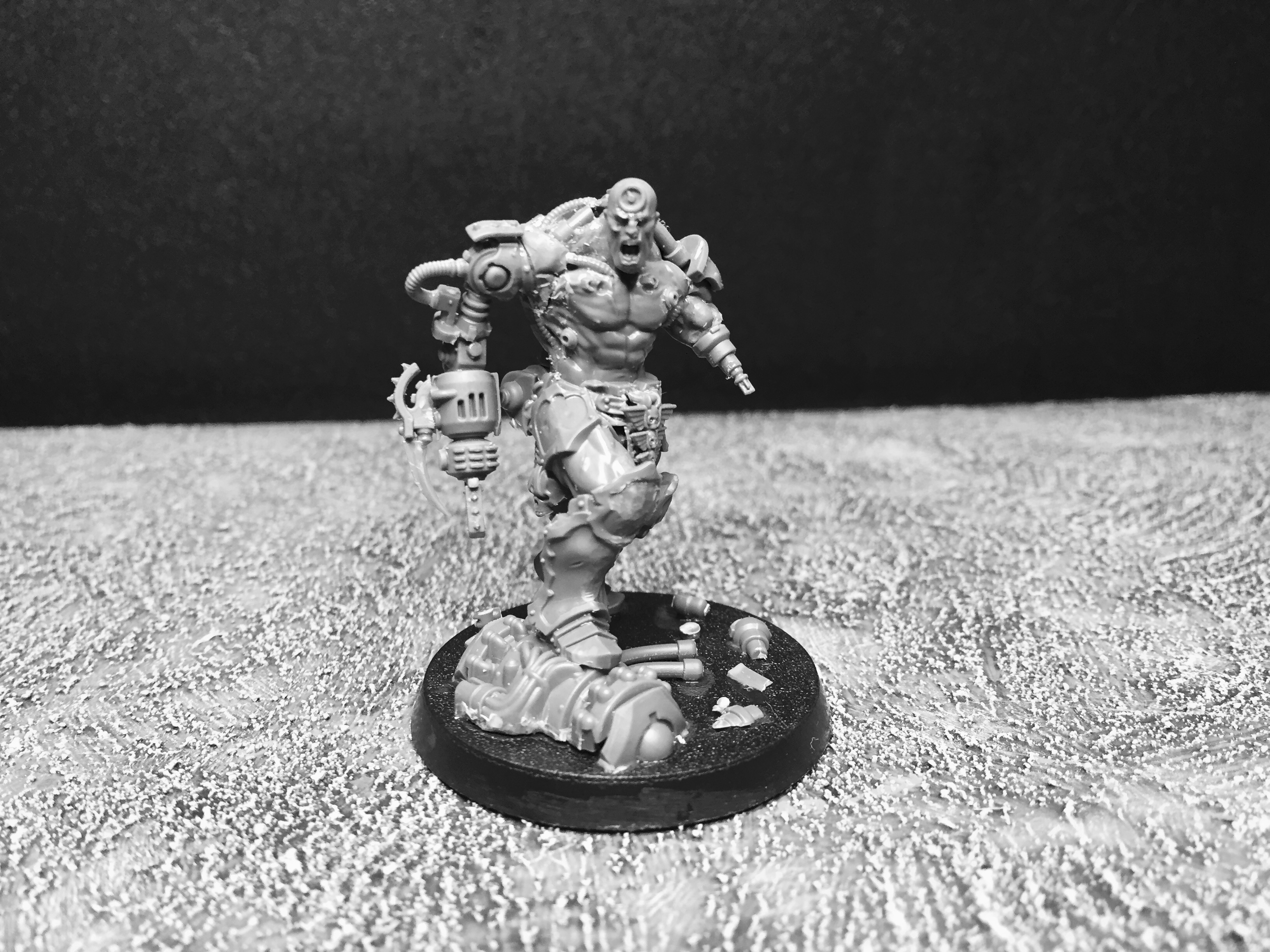 So… I’ve been pondering what to work on for my return, and (as you can imagine) I have a number of options. For starters, I have the Silver Tower game to sort out, plus several lovely Kickstarters that shipped recently. Also, I want to expand on the techno-barbarians, I have some Frostgrave creatures to sort out, and I have a number of small Confrontation collections to tackle as well… Such decisions! In the end, I decided to finish up my pit slave conversion, just to get my eye in, so to speak. He’s based on the AoS Slaughter Priest, and we last saw him in this state: