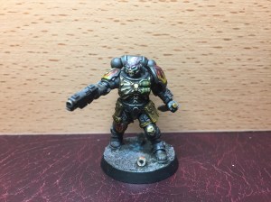 I think the Plasma guys are called Hellblasters, and I think the big jump-pack guy is an Aggressor? Whatever they are called, they made a fun change from the Bolter boys. One thing to note here – I really don’t like using flying bases on mins if I can help it, and I didn’t want to use one on the jump-pack guy. I tried to make it look like he was just dropping over the wall, and had kicked a bit of rubble off as he clipped the top. The illusion isn’t perfect, but I still prefer it to a flying stand…
