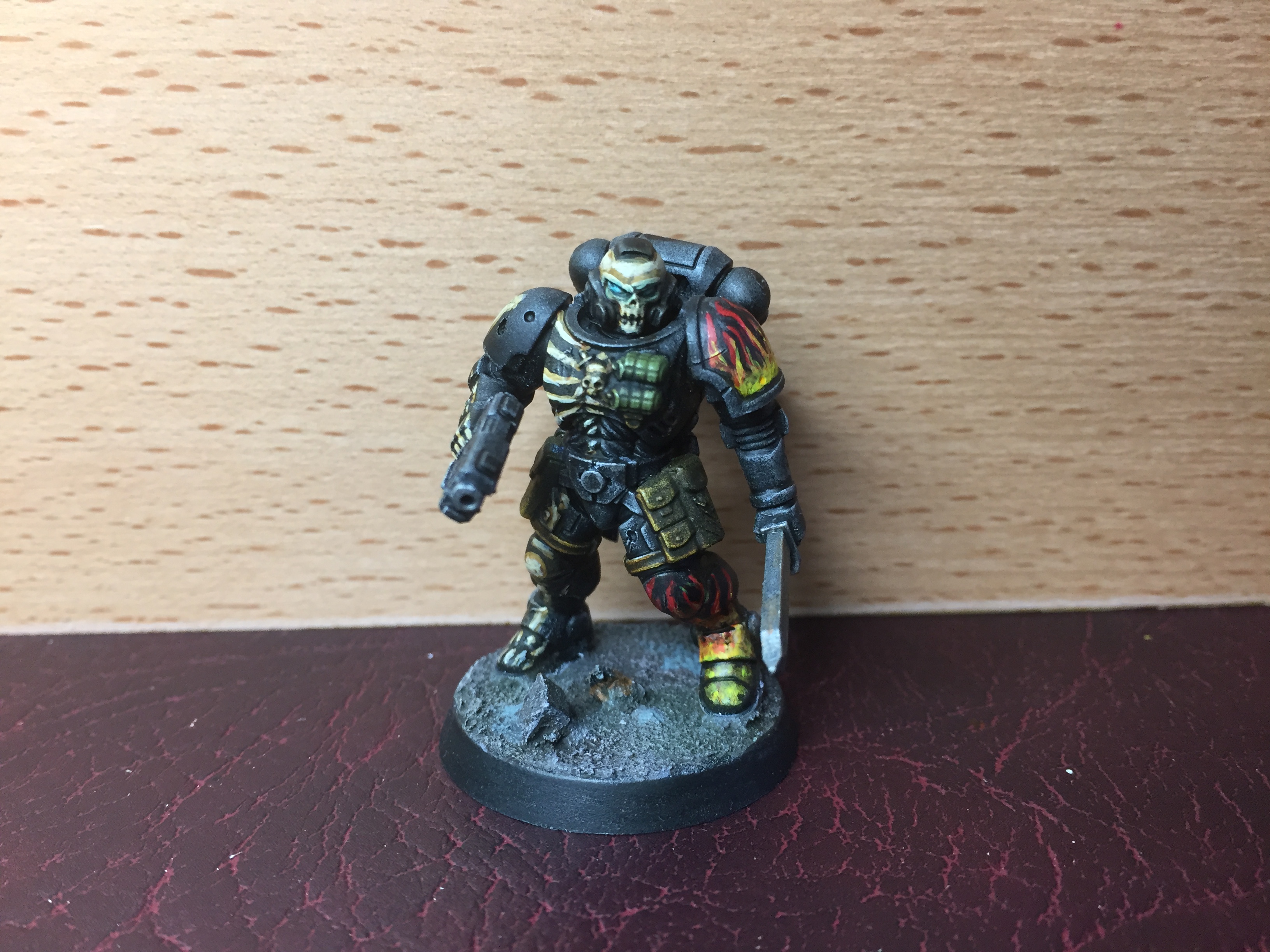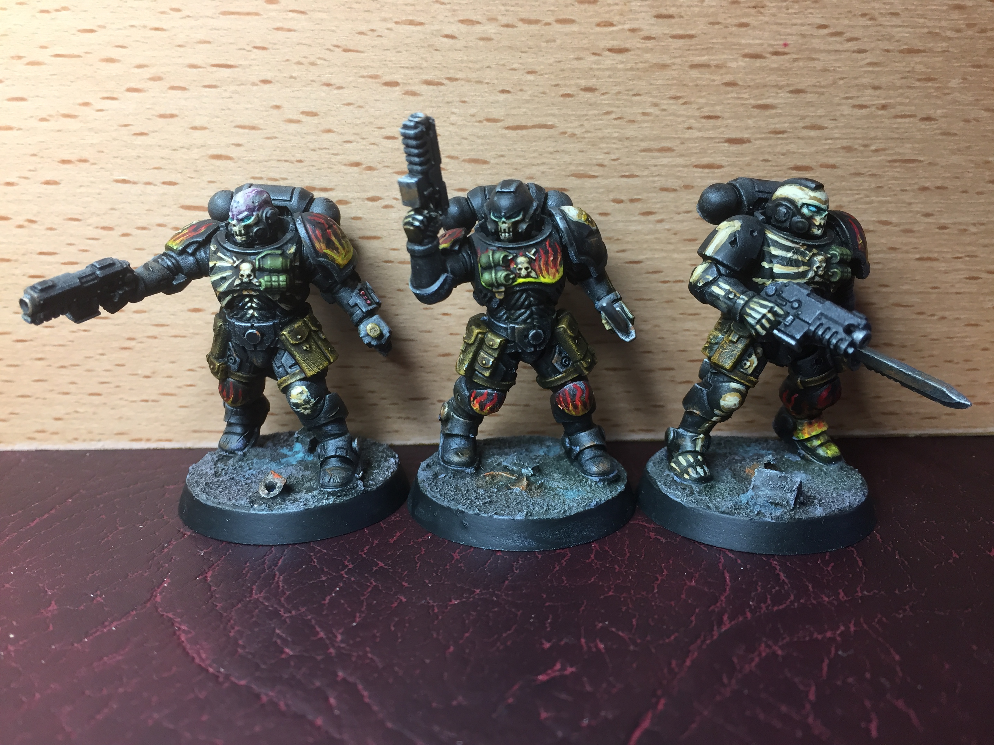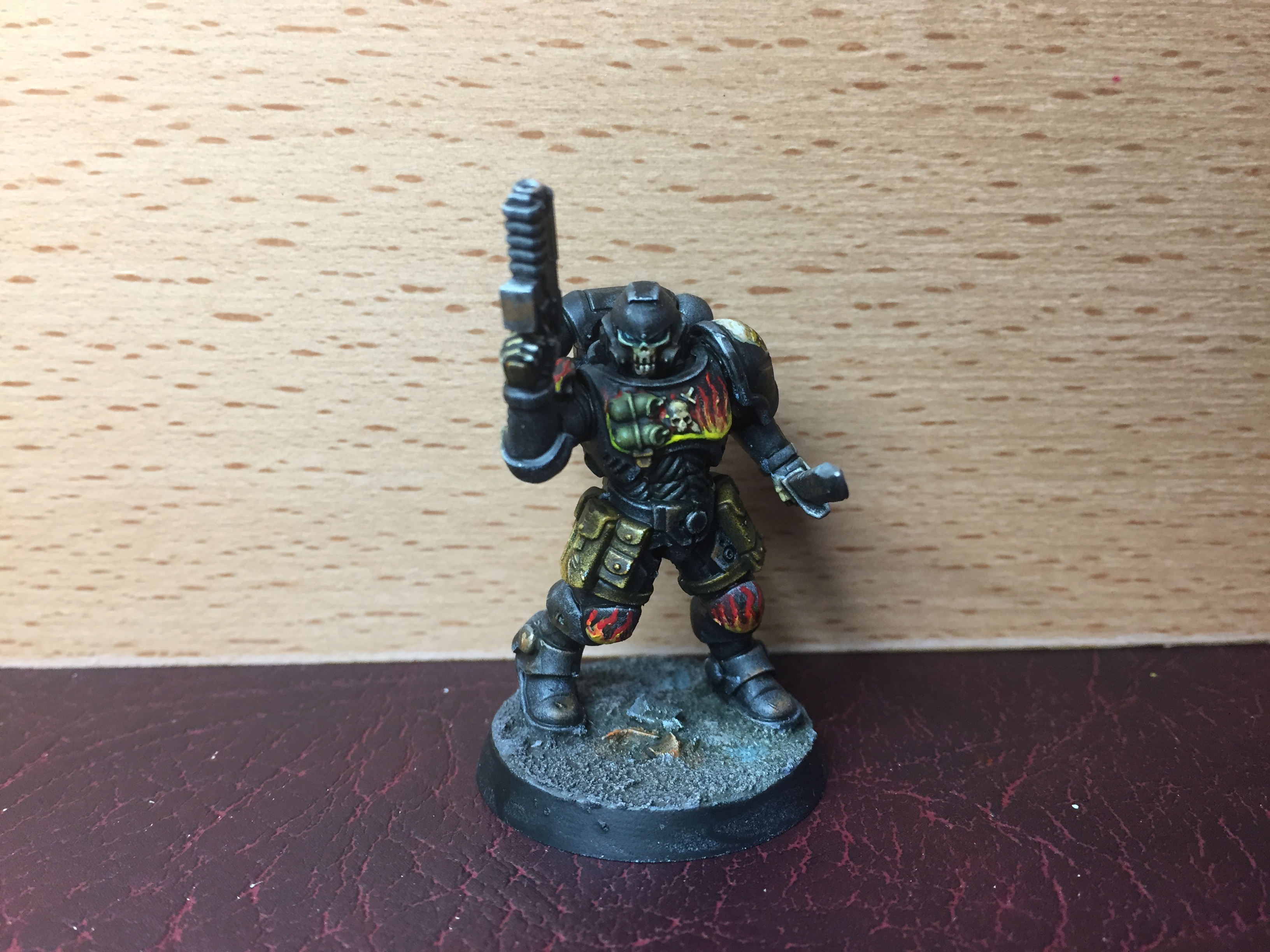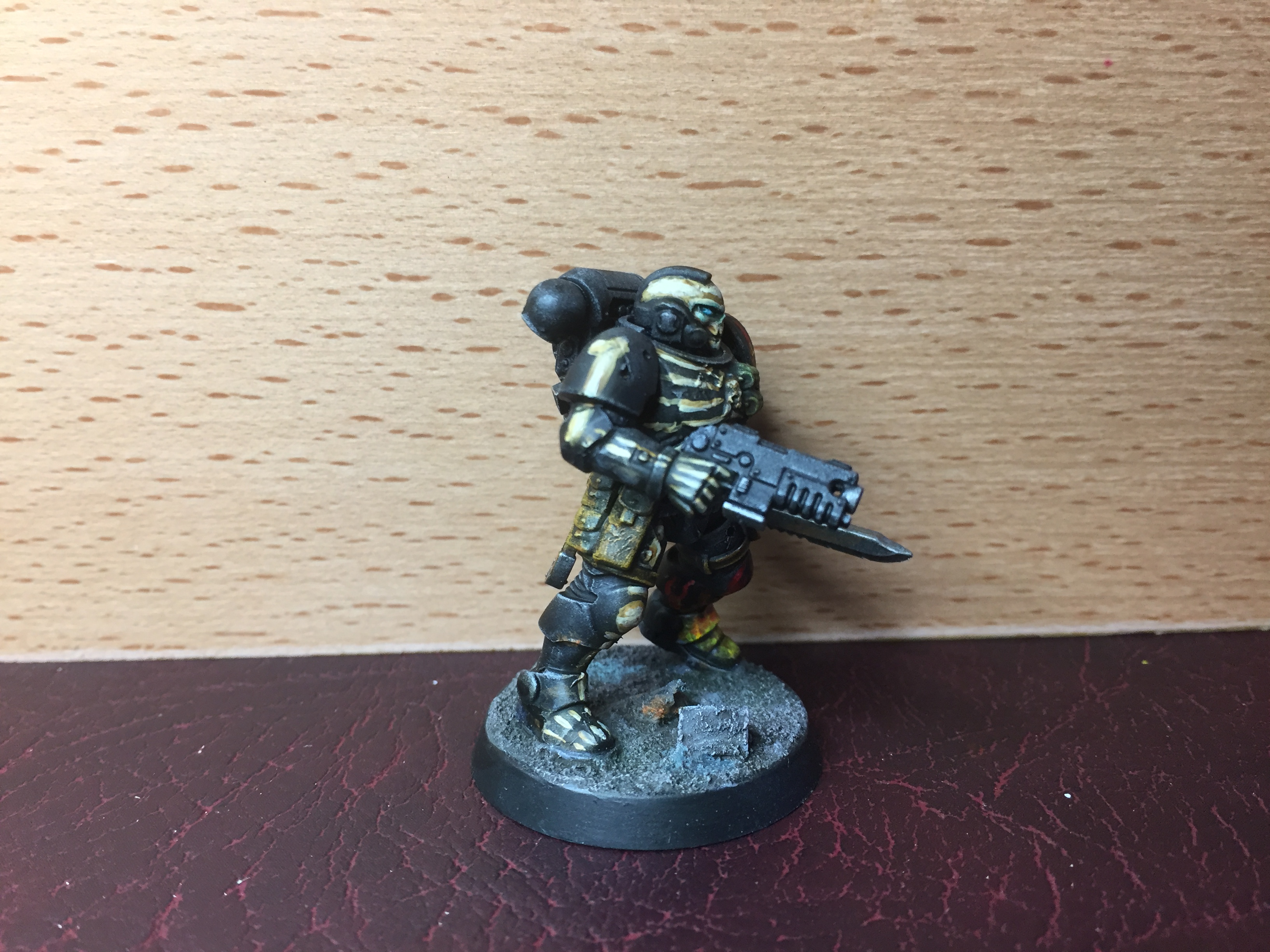 I think the Plasma guys are called Hellblasters, and I think the big jump-pack guy is an Aggressor? Whatever they are called, they made a fun change from the Bolter boys. One thing to note here – I really don’t like using flying bases on mins if I can help it, and I didn’t want to use one on the jump-pack guy. I tried to make it look like he was just dropping over the wall, and had kicked a bit of rubble off as he clipped the top. The illusion isn’t perfect, but I still prefer it to a flying stand…